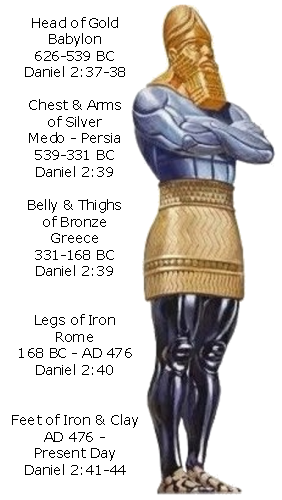 All four kingdoms (the image, gold, silver, bronze and iron and clay) are going to be "crushed together" and became "like chaff from the summer threshing floors", the wind carried them away so that "no trace of them was found: